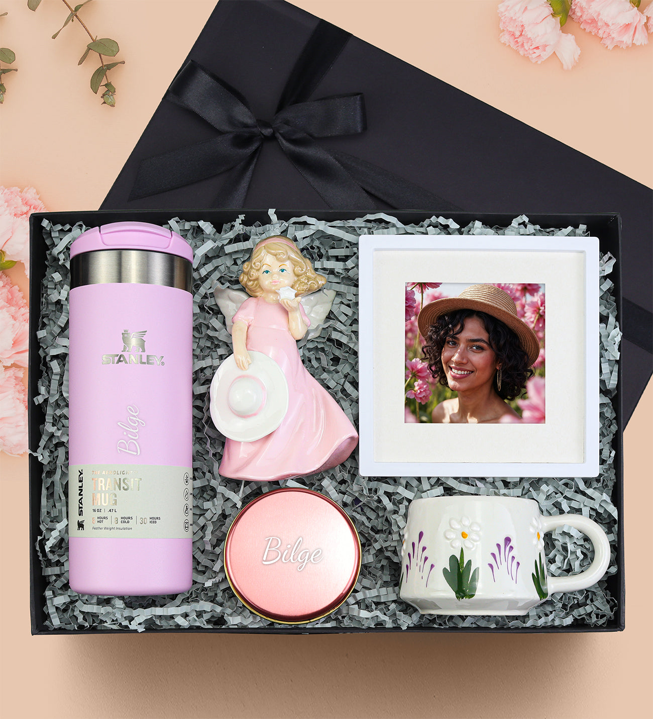 Set İçeriği: 1 Adet The AeroLight™ Transit Mug Stanley Termos 0.47L Pembe & 1 Adet Melek Biblo & 1 Adet Paspartu Çerçeve & 1 Adet El Yapımı Kupa & 1 Adet Rose Metal Kutulu Mum