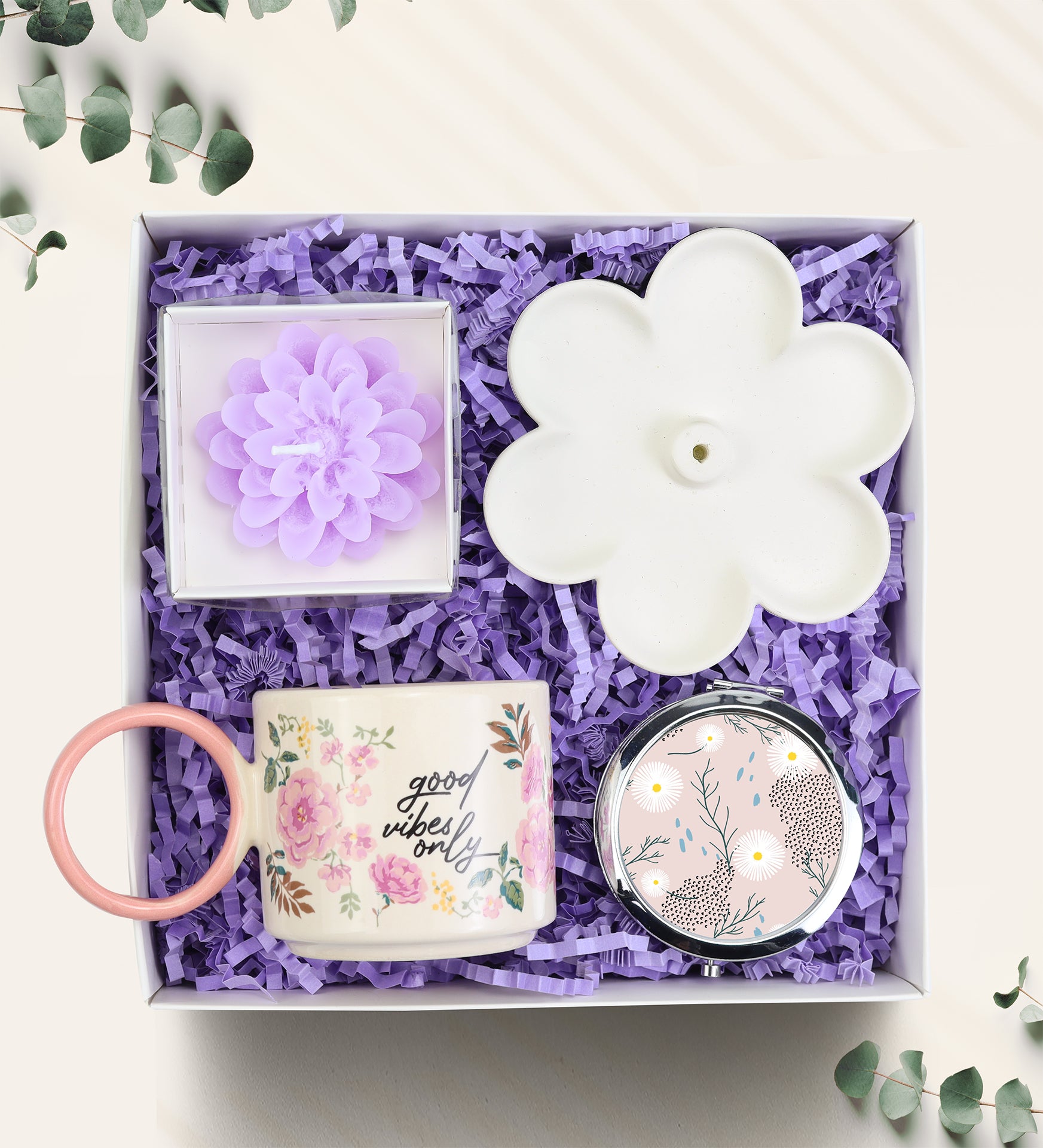 Set içeriği: 1 Adet Papatya Tütsülük & 1 Adet El Aynası & 1 Adet Halka Kulplu Kupa & 1 Adet Lotus Mum