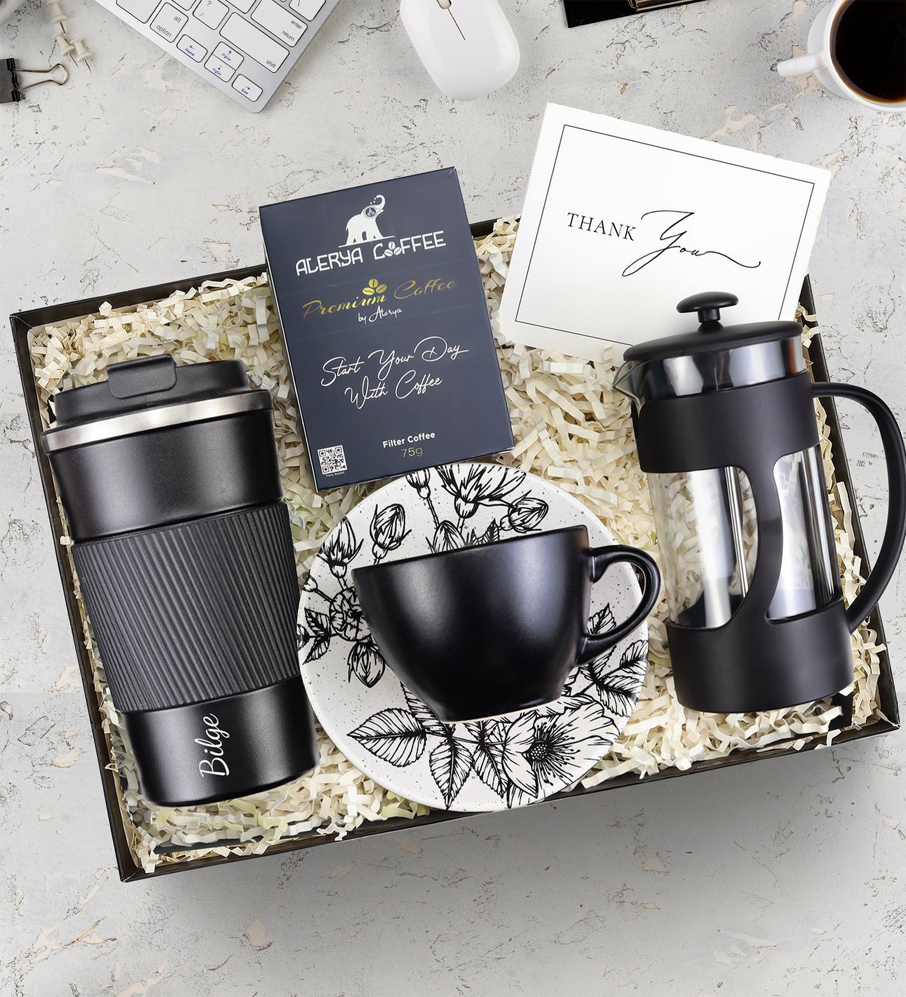 Set içeriği: 1 Adet Kişiye Özel 500 ml Çelik Termos & 1 Adet Fincan & 1 Adet Alerya Premium Filtre Kahve & 1 Adet Siyah French Press