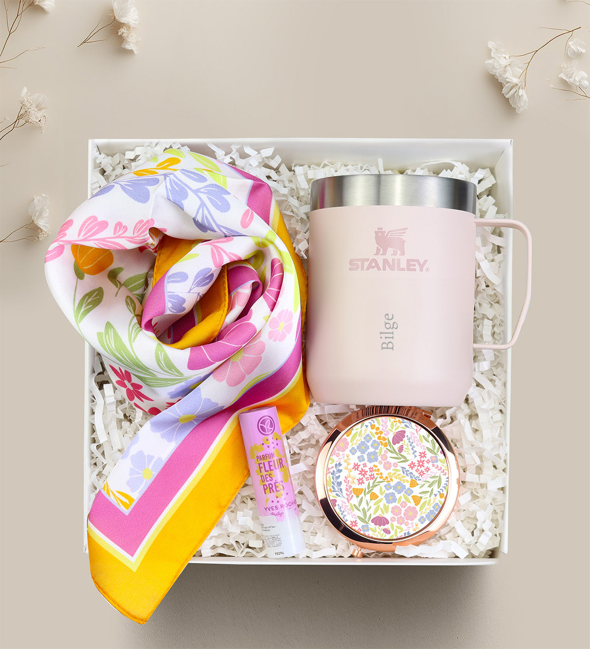 Set İçeriği: 1 Adet Kişiye Özel Stanley Kamp Kupası & 1 Adet Tasarım Fular & 1 Adet El Aynası & 1 Adet Fular & 1 Adet Yves Rocher Dudak Nemlendirici