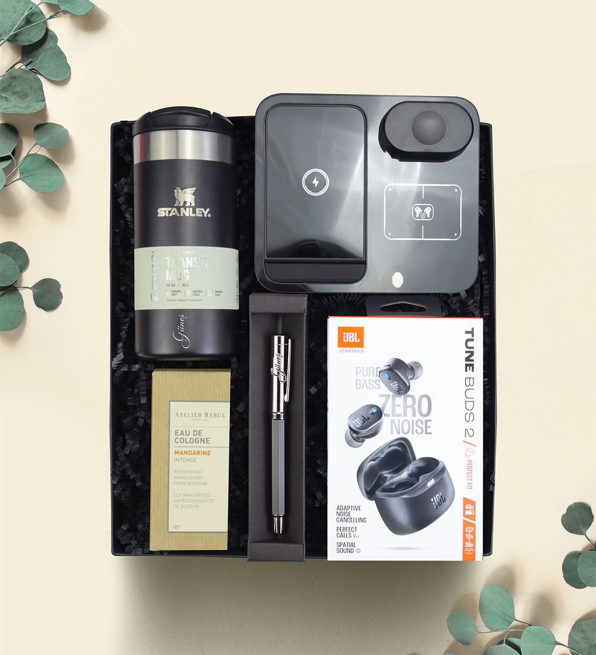 Set içeriği: 1 Adet Stanley Siyah Üçlü Standlı Wireless Şarj Cihazı & 1 Adet JBL Tune Buds2 Bluetooth Kulak İçi Kulaklık - Siyah & 1 Adet Roller Kalem & 1 Adet Stanley Termos & 1 Adet Ateiler Rebul Kolonya