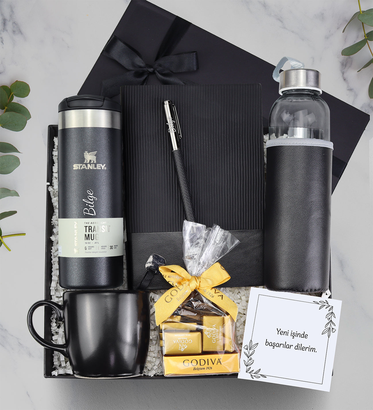 Set İçeriği: 1 Adet Stanley Transit Mug Termos 0,47 L & 1 Adet Esnek Kapak Defter & 1 Adet Siyah Kupa & 1 Adet Roller Kalem & 1 Adet Deri Kılıflı Su Matarası & 1 Adet Godiva Napoliten Çikolata