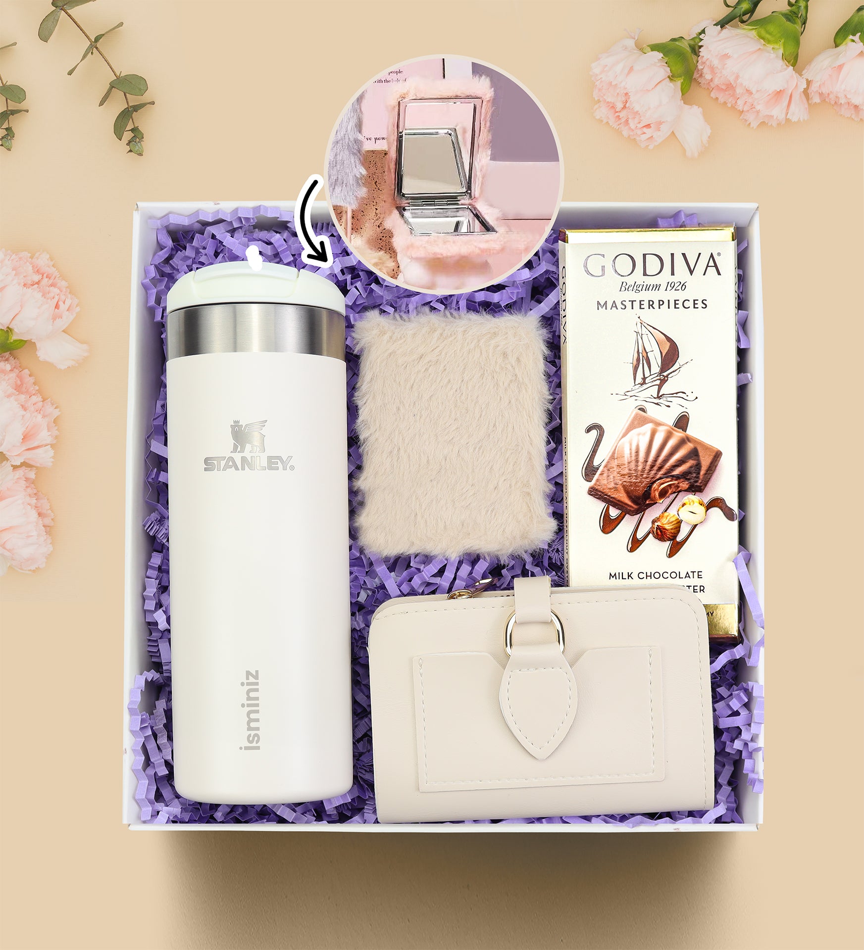 Set içeriği: 1 Adet Stanley Termos & 1 Adet Godiva Çikolata & 1 Adet Yumuşak Deri Kartlık Cüzdan & 1 Adet Peluş Ayna